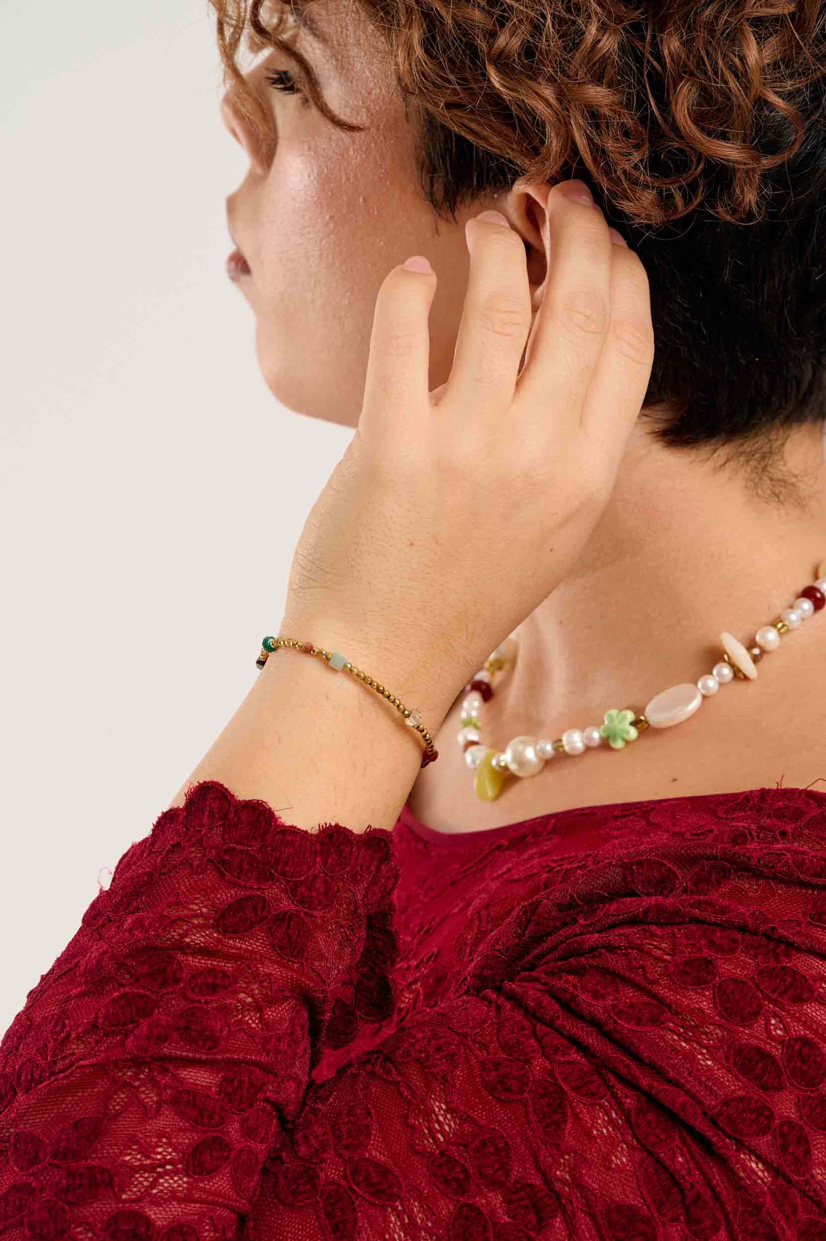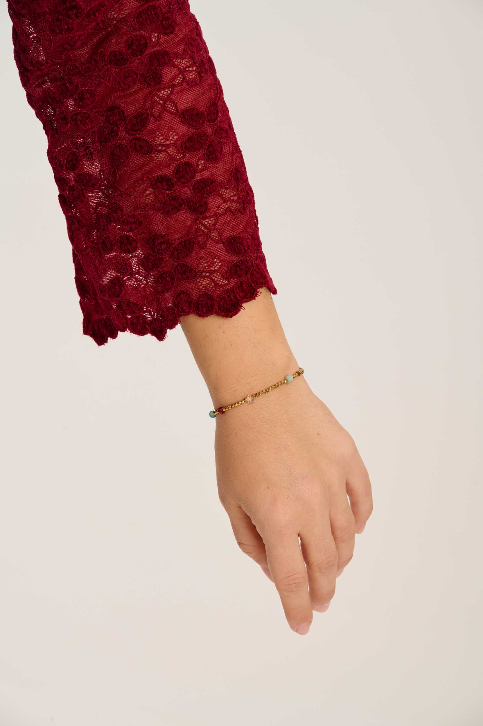 Το Auric βραχιόλι αποτελείται από διάφορες χρωματιστές πέτρες και αιματήτες, κάτι που το κάνει παιχνιδιάρικο και ανθεκτικό στο νερό. Συνδύασε το με άλλα χρυσά κοσμήματα και το αποτέλεσμα θα είναι λαμπερό και κομψό.