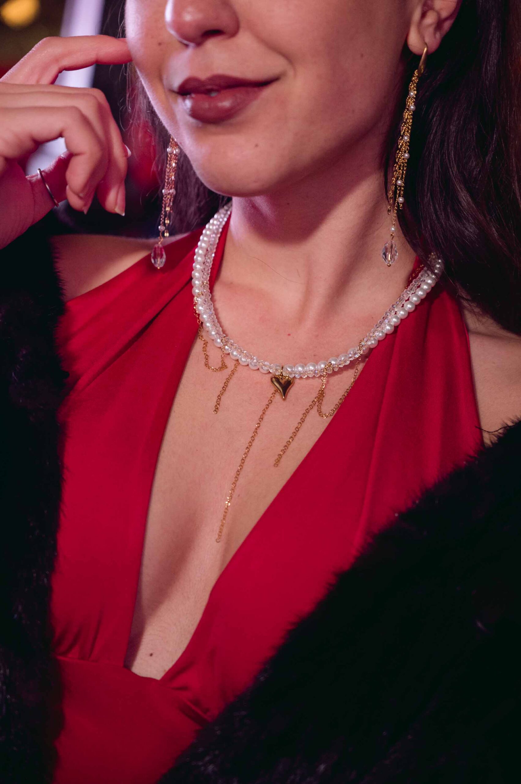 Το κολιέ Eira ξεχωρίζει με τον ιδιαίτερο διπλό σχεδιασμό του, όπου οι πέρλες, τα κρυσταλλάκια και οι ασύμμετρες αλυσίδες δημιουργούν ένα μοντέρνο αλλά ταυτόχρονα ρομαντικό αποτέλεσμα. Το μικρό στοιχείο καρδιάς προσθέτει μια διακριτική πινελιά γοητείας, κάνοντας το κόσμημα ιδανικό για να τραβήξει τα βλέμματα. Ένα χειροποίητο κομμάτι που δίνει χαρακτήρα σε κάθε εμφάνιση.