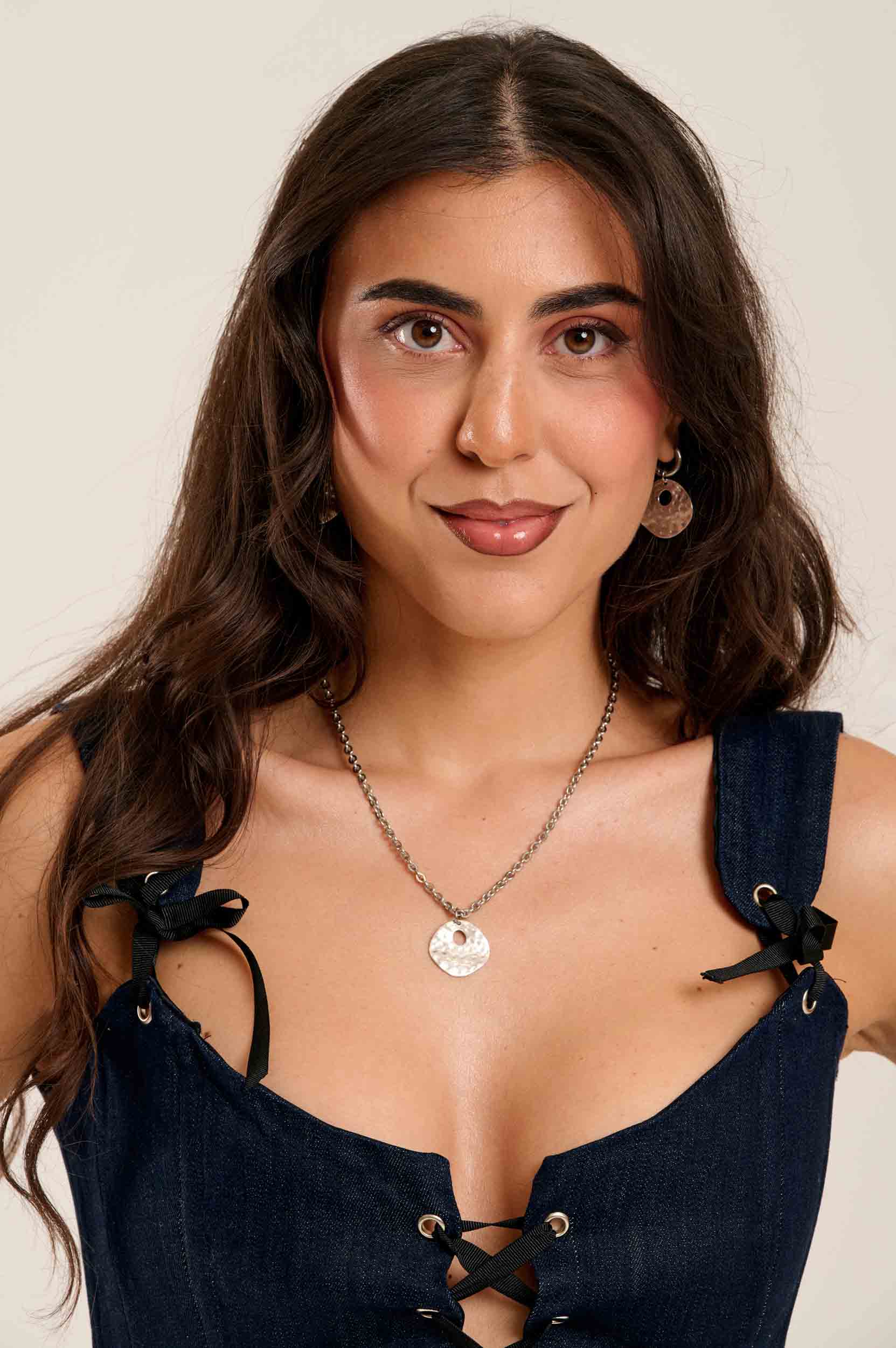 Κολιέ με ατσάλινη αλυσίδα και ανάγλυφο επάργυρο μεταλλικό στοιχείο.