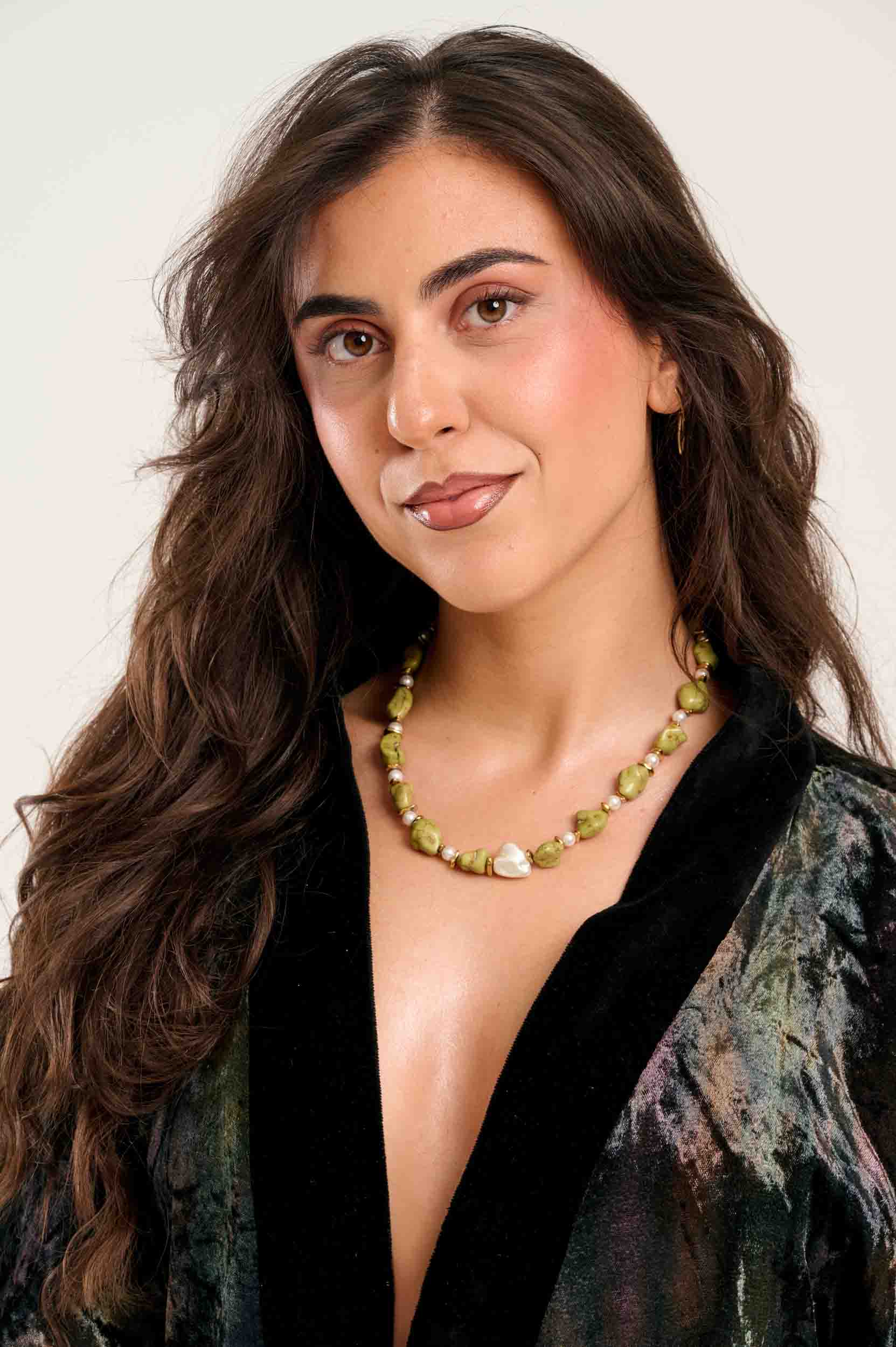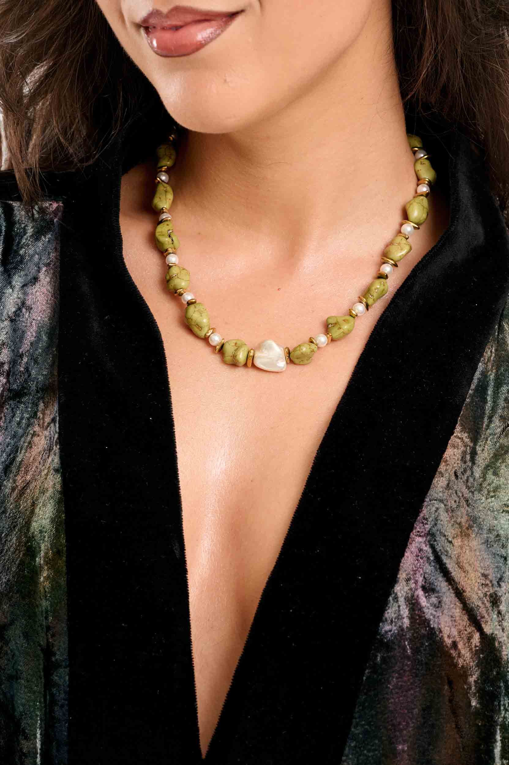 Κολιέ με ημιπολύτιμες πέτρες, λαδί χαολίτης, αιματίτες επίχρυσοι, λευκές πέρλες.