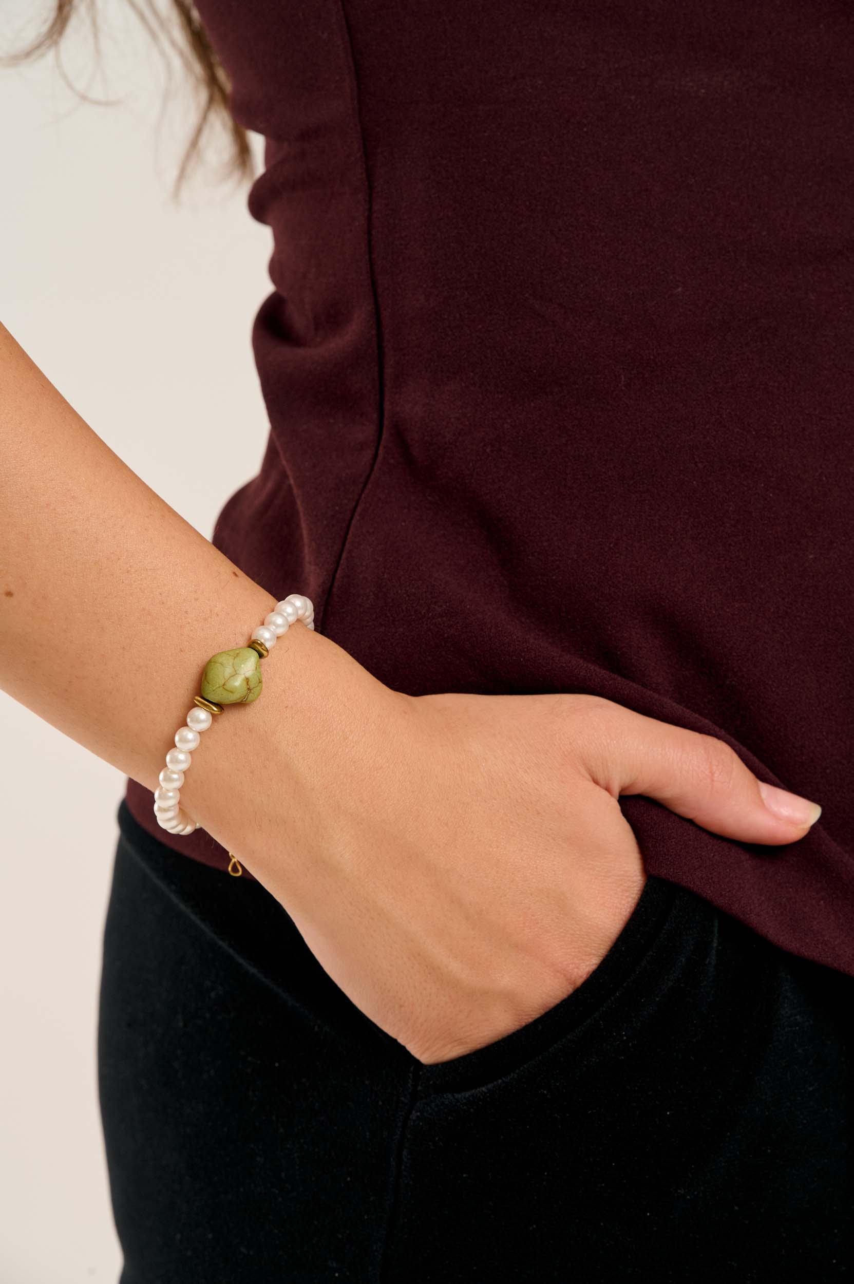 Το Gaia Bracelet είναι ένα χειροποίητο βραχιόλι που συνδυάζει λευκές πέρλες, τσιπς αιματίτη και λαδί χαολίτη — μια μοναδική σύνθεση που αποπνέει φυσική αρμονία και γήινη αισθητική. Με minimal σχεδιασμό και ευχάριστους χρωματικούς τόνους, ταιριάζει άψογα τόσο με καθημερινά όσο και με πιο ιδιαίτερα σύνολα.