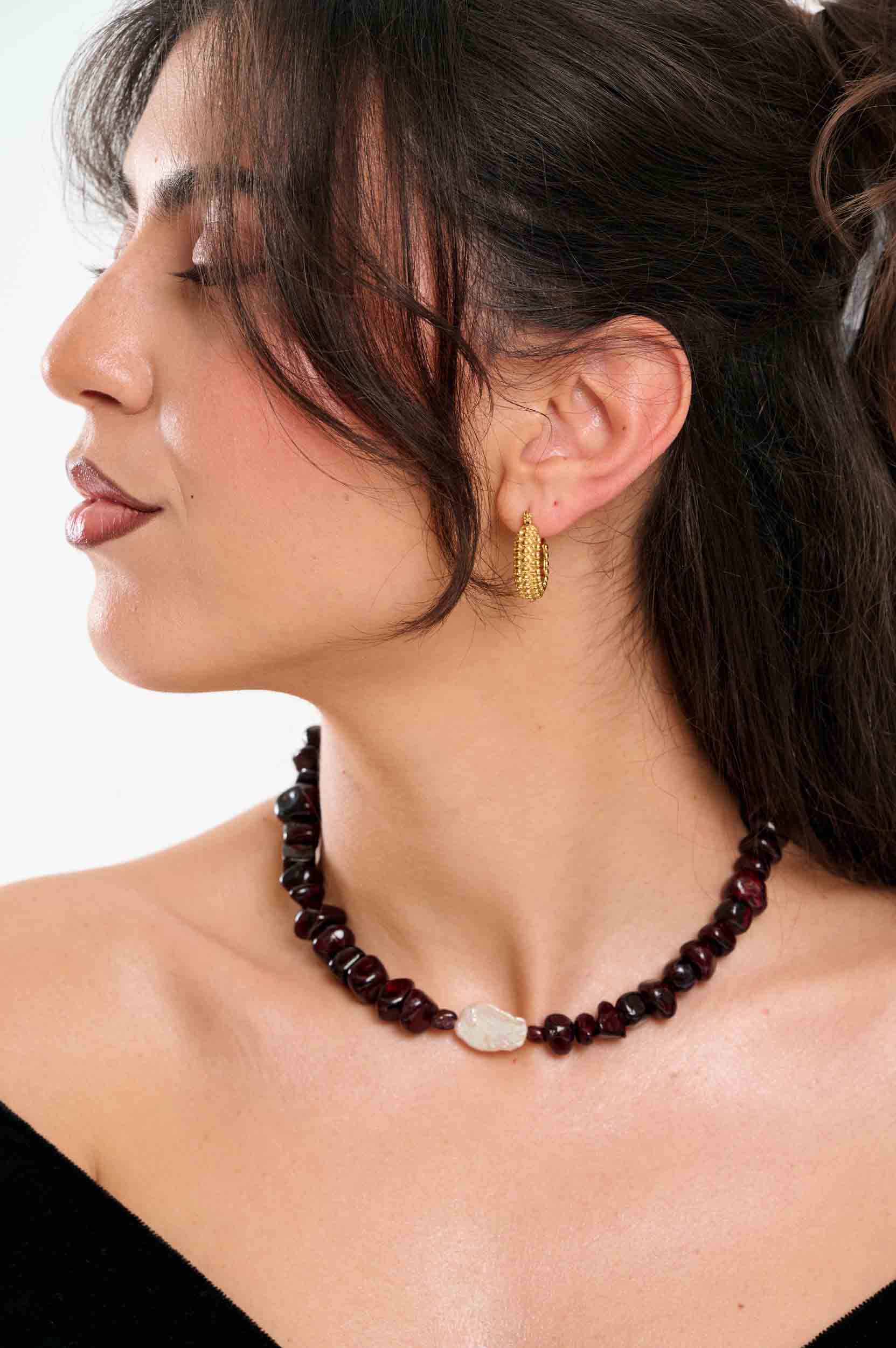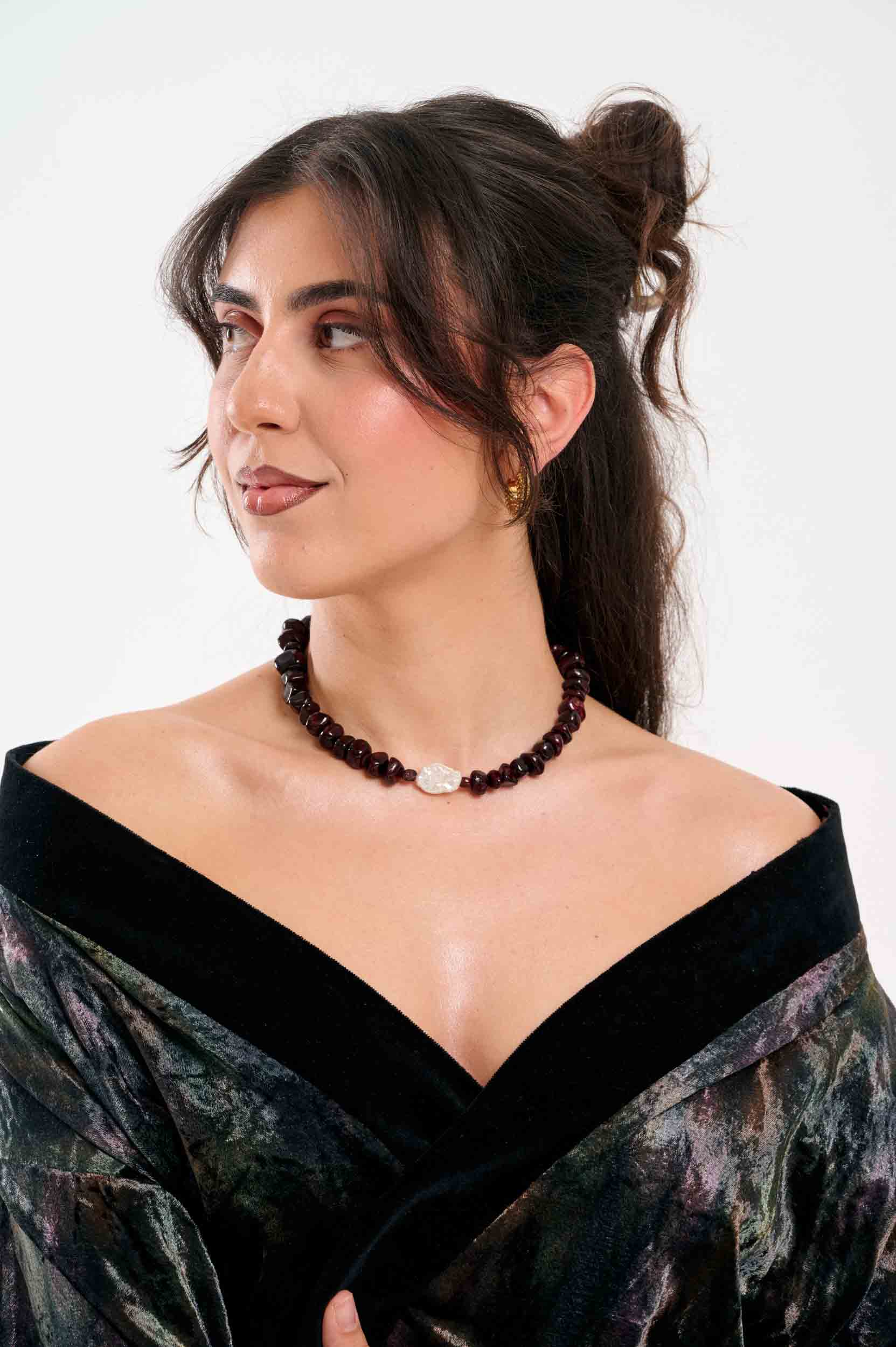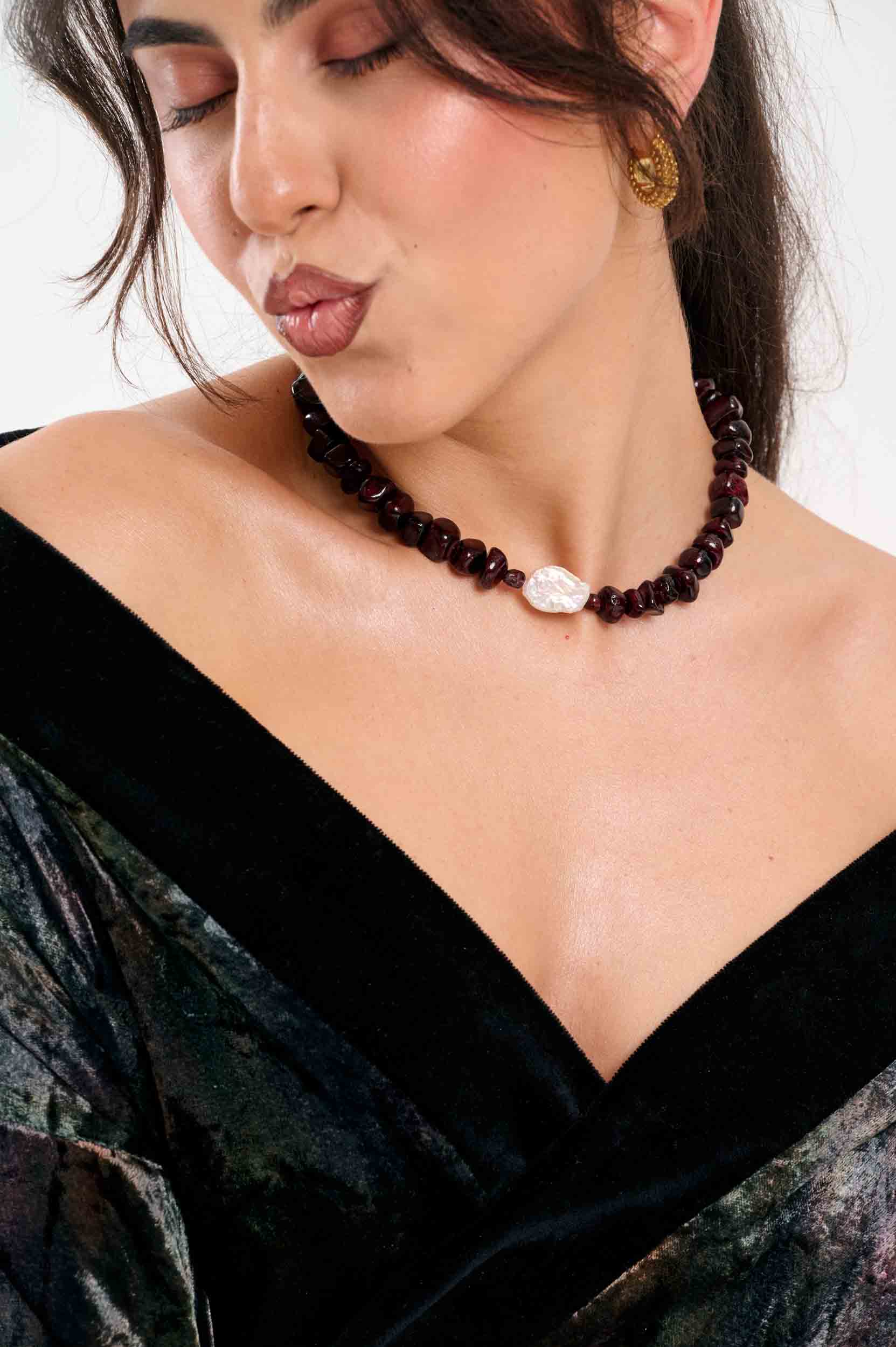 Κολιέ με ημιπολύτιμες πέτρες, μπορντό νεφρίτης, λευκό πλακέ μαργαριτάρι.