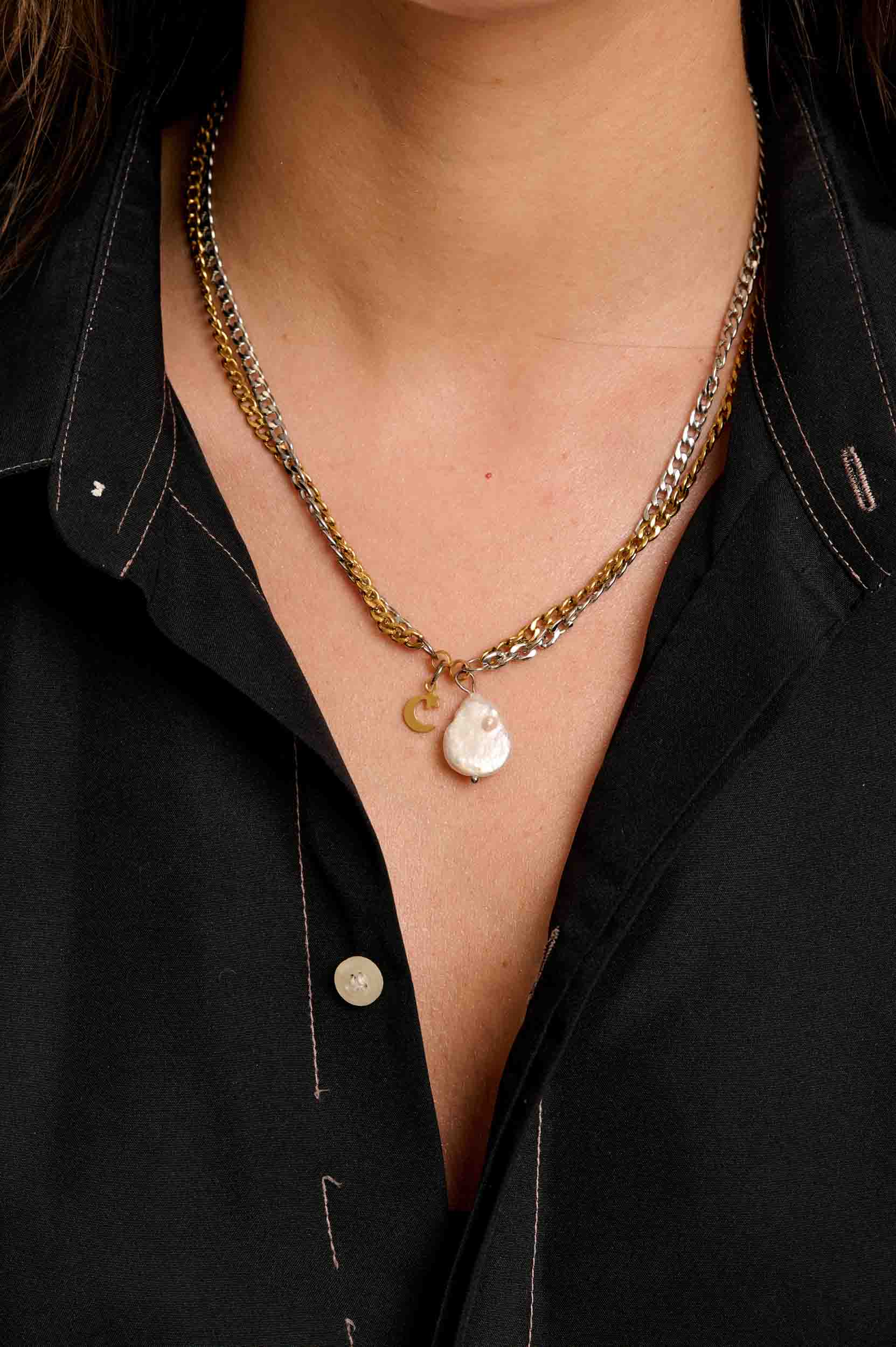 Ατσάλινο δίχρωμο κολιέ με μαργαριτάρι και στοιχείο επιχρυσωμένο.