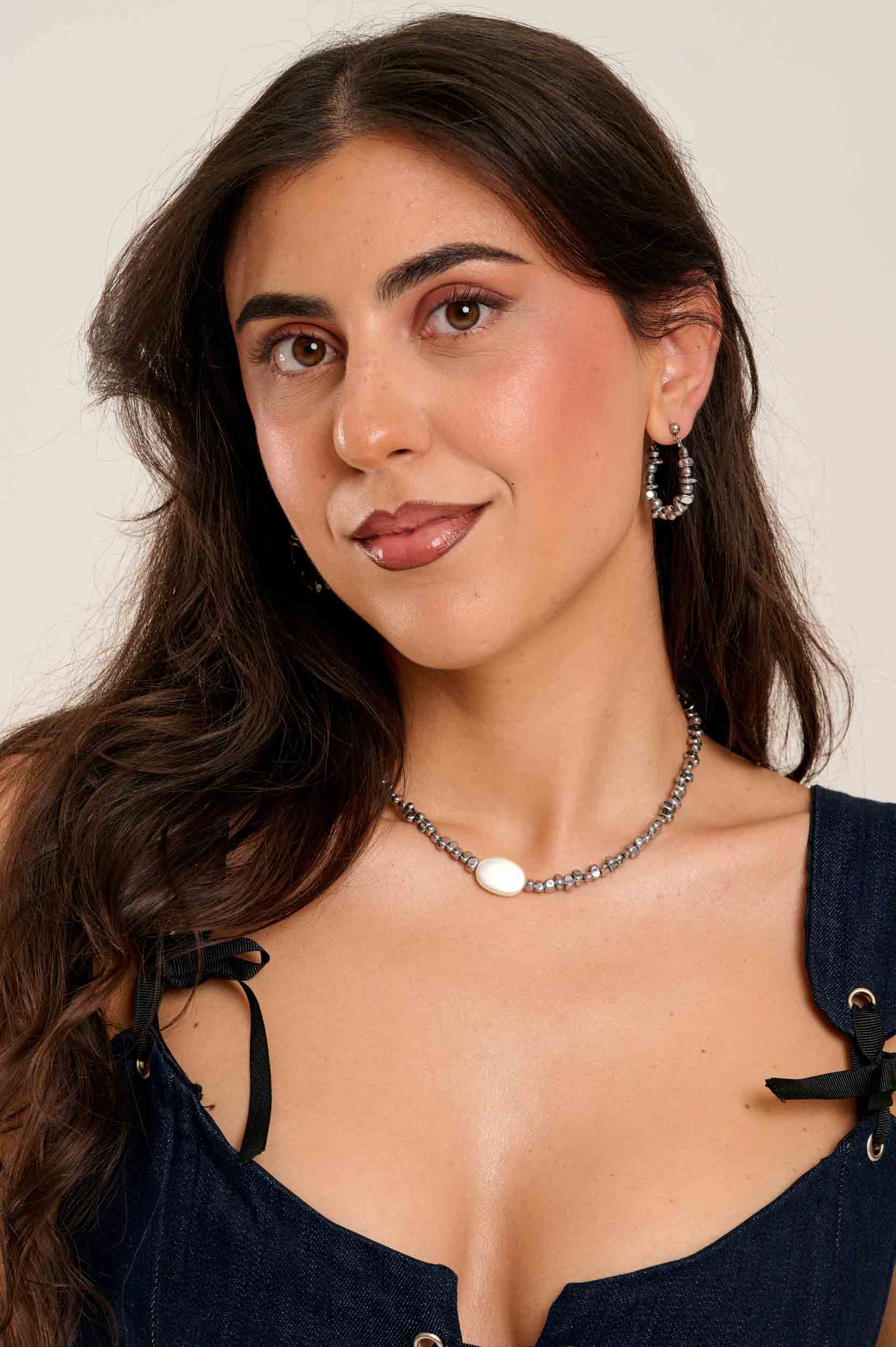 Κολιέ από ανθρακί αιματήτες και ακρυλικό περλέ στοιχείο.