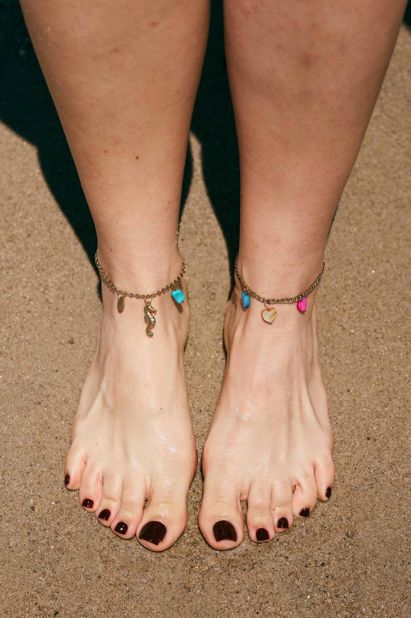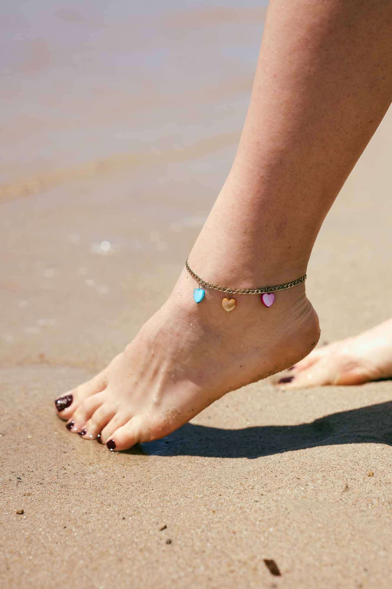 Ατσάλινη επιχρυσωμένη αλυσίδα ποδιού με φίλντισι χρωματιστές καρδιές.