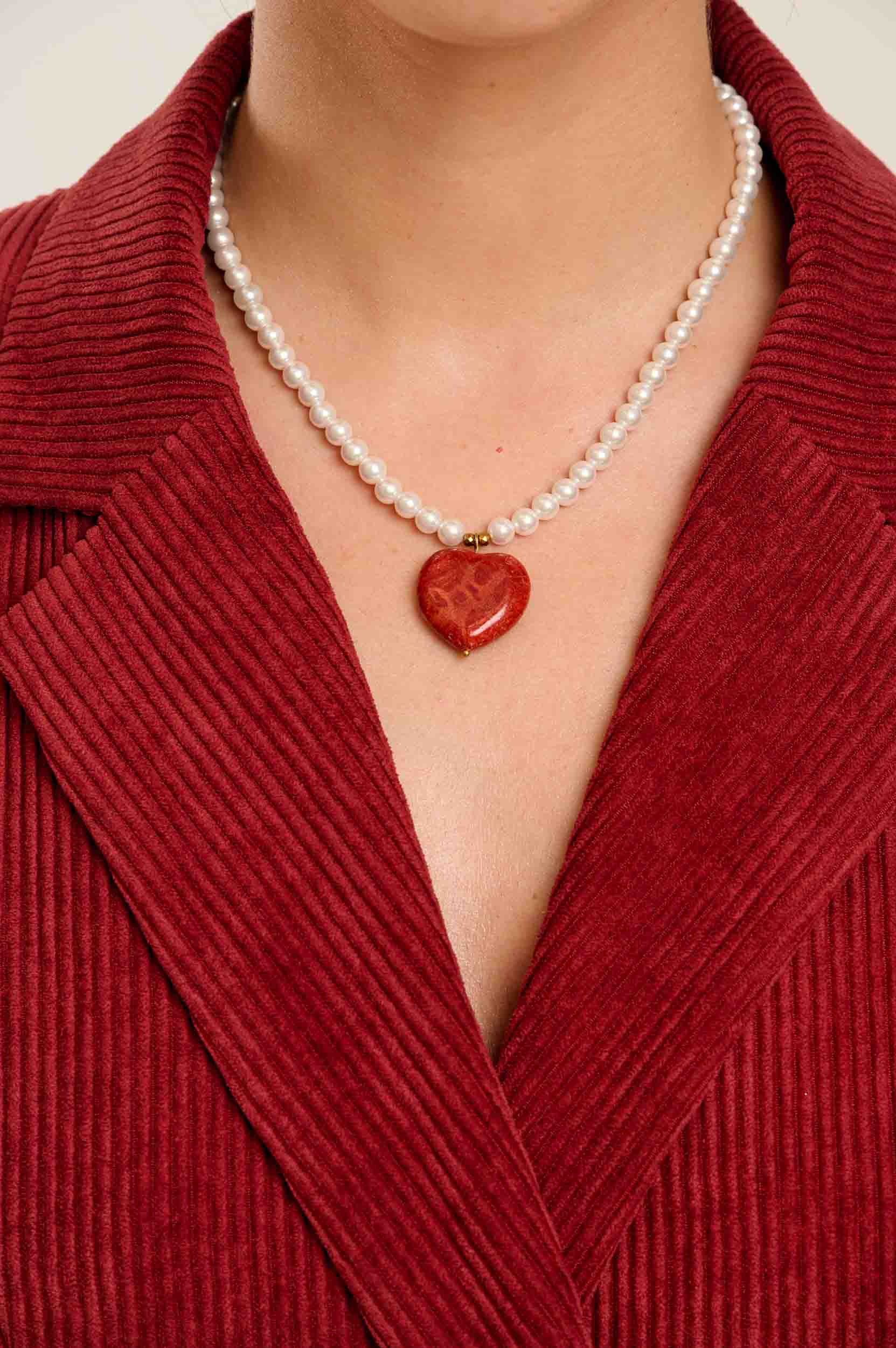 Το κολιέ Rouge δημιουργήθηκε για να δώσει χρώμα και “προσωπικότητα” σε κάθε σου εμφάνιση.Συνδυάζει την αθωότητα των λευκών περλών με την ένταση μιας καρδιάς από κόκκινο κοράλλι μπαμπού. Είναι το κομμάτι που θα φοράς όταν θέλεις να νιώθεις chic, ρομαντική, αλλά και απόλυτα σύγχρονη.